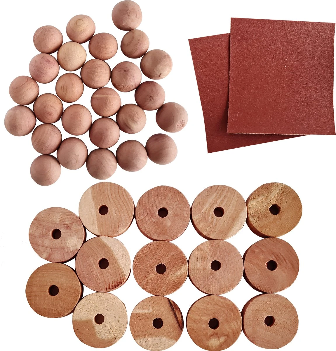 Het pakket bevat 40 stuks het 14 ringen, 26 ballen en 2 schuurpapieren. De ringen passen om de haak van de kleren hanger. De overige ballen plaats je bijvoorbeeld in je kledingla. Vergeet niet met de bijgeleverde schuurpapieren de ringen en de ballen op te schuren voor maximaal resultaat.