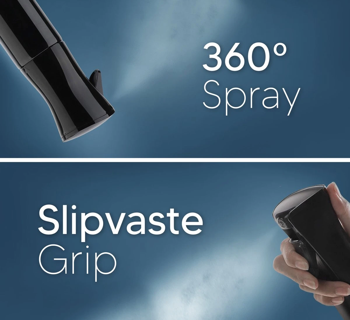 - Lange spray – De 5 seconde lange spray creëert een constante en fijne mist in een perfecte hoeveelheid water om het haar te verzadigen.
