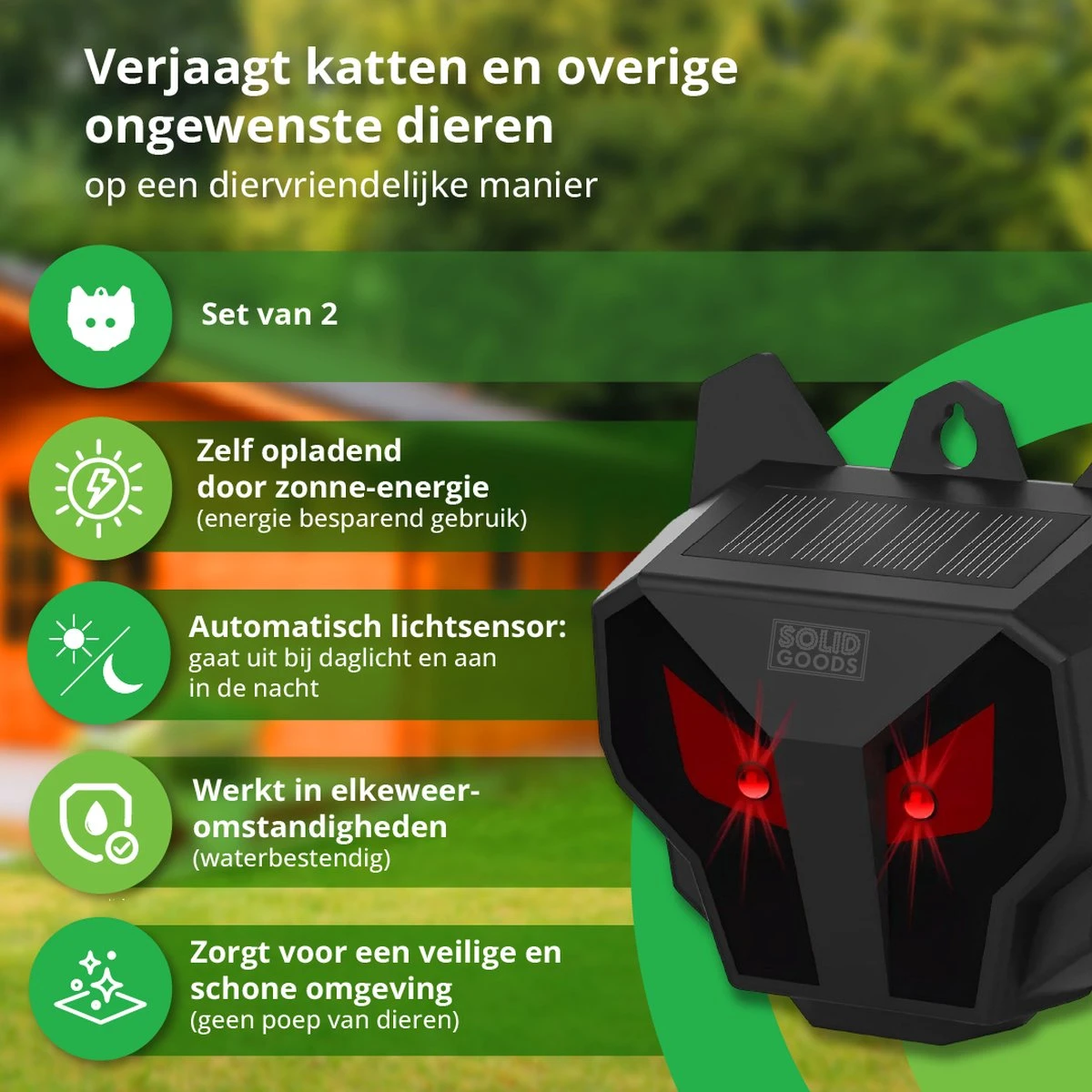 Heb je last van katten en andere ongewenst dieren en heb je liever niet dat jouw tuin als speeltuin of toilet wordt gebruikt? En wil je daar een diervriendelijke en duurzame oplossing voor? Met de slimme SolidGoods kattenverjager wordt ieder tuin kat-vrij dankzij LED flash-light en ultrasoon geluid. Zodat je kan genieten van een schoon en veilig omgeving.