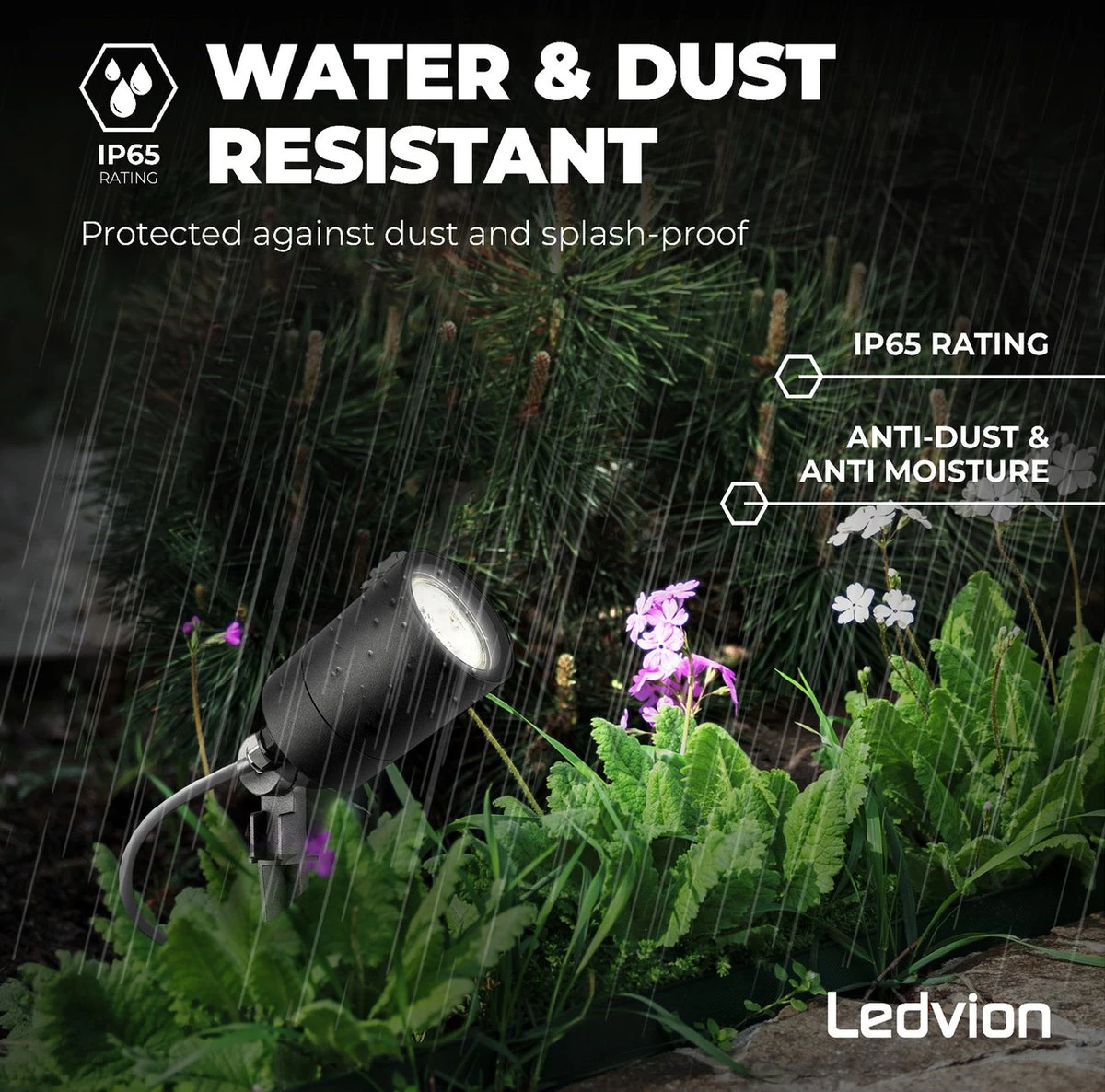 Doordat de prikspot LED 230v een IP65 classificering heeft is deze ideaal te gebruiken in de tuin. Dit houdt namelijk in dat de prikspot stof- en spatwaterdicht is. Hierdoor is de prikspot beschermd tegen opspattend water zoals bijvoorbeeld regen.