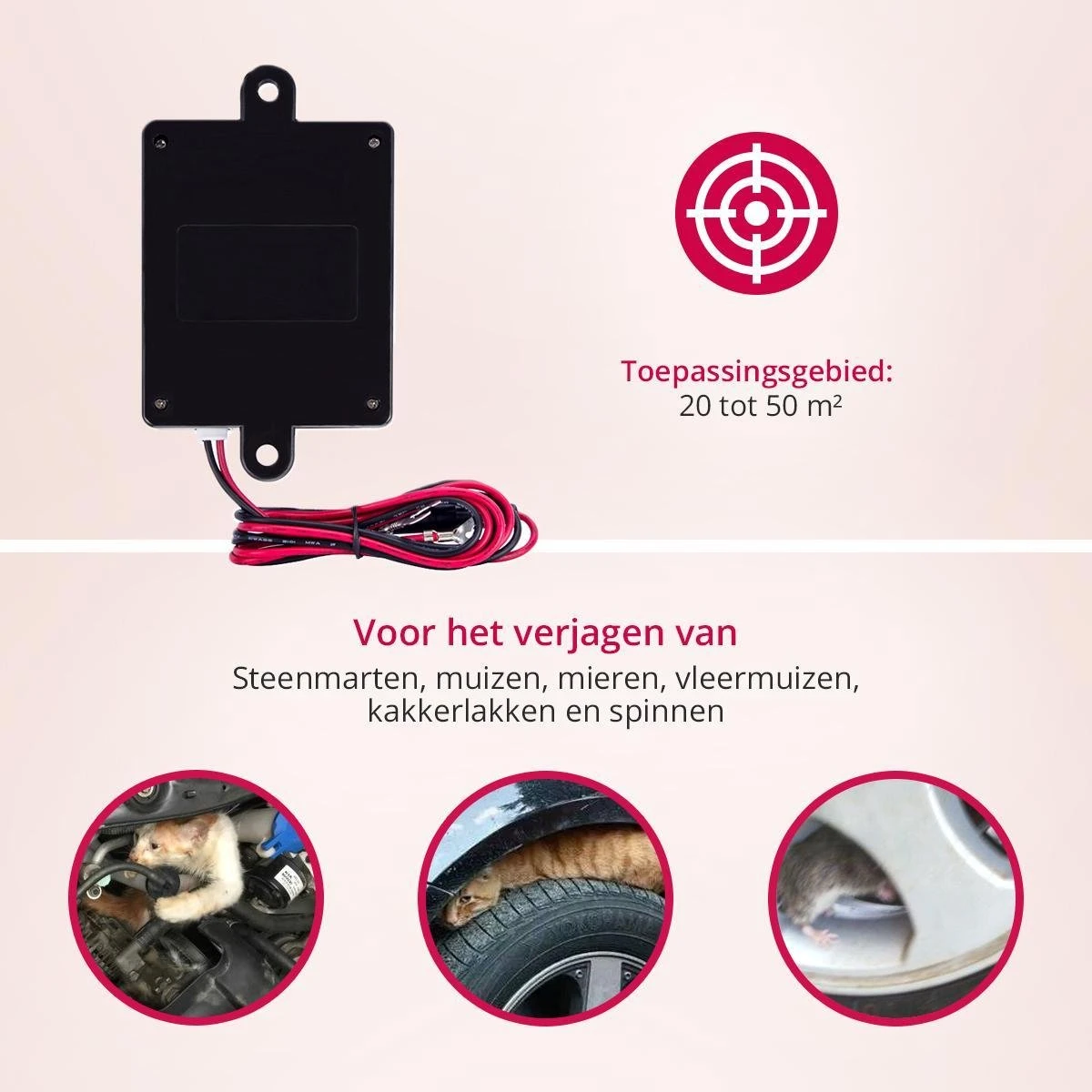 De marterverjager kan makkelijk worden aangesloten aan de accu van de auto, motor, tractor en boot. De marterverjager blijft continu werken totdat het voertuig in beweging komt. Er zal een variabele frequentie tussen de 22 en 45khz hoorbaar zijn voor ongedierte, de frequentie wisselt periodiek om een beter resultaat te krijgen. Soms raken marters gewend aan een bepaalde frequentie, waardoor de verjager niet meer werkt. Dit voorkomen wij door de frequentie om de twintig seconde te veranderen.