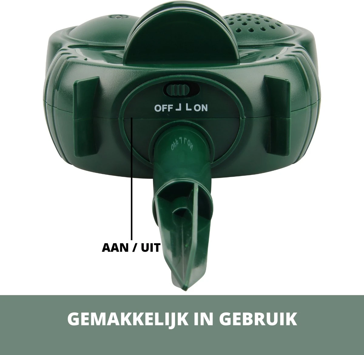 De kattenverjager is eenvoudig te installeren door de (grond)pin aan de kop te bevestigen (zie video) en deze vervolgens in de grond te drukken. Ook kan deze zonder pin opgehangen worden aan een muur of schutting. Gebruik hiervoor de gemonteerde gaten aan de achterzijde van het product (zie afbeelding). Na het plaatsen hoeft u er in principe niet meer naar om te kijken aangezien dit product zichzelf van stroom voorziet.
