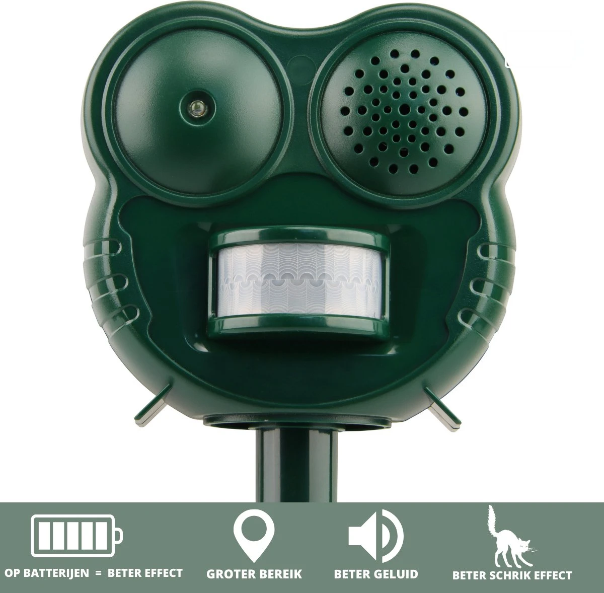 Doordat deze kattenverjager op batterijen werkt functioneert deze beter dan andere kattenverjagers. Dit omdat solar (bewezen) niet effectief genoeg werkt omdat vele kattenverjagers in bosjes staan. Hierdoor vangen kattenverjagers op solar niet genoeg licht en werken deze dus niet naar behoren.