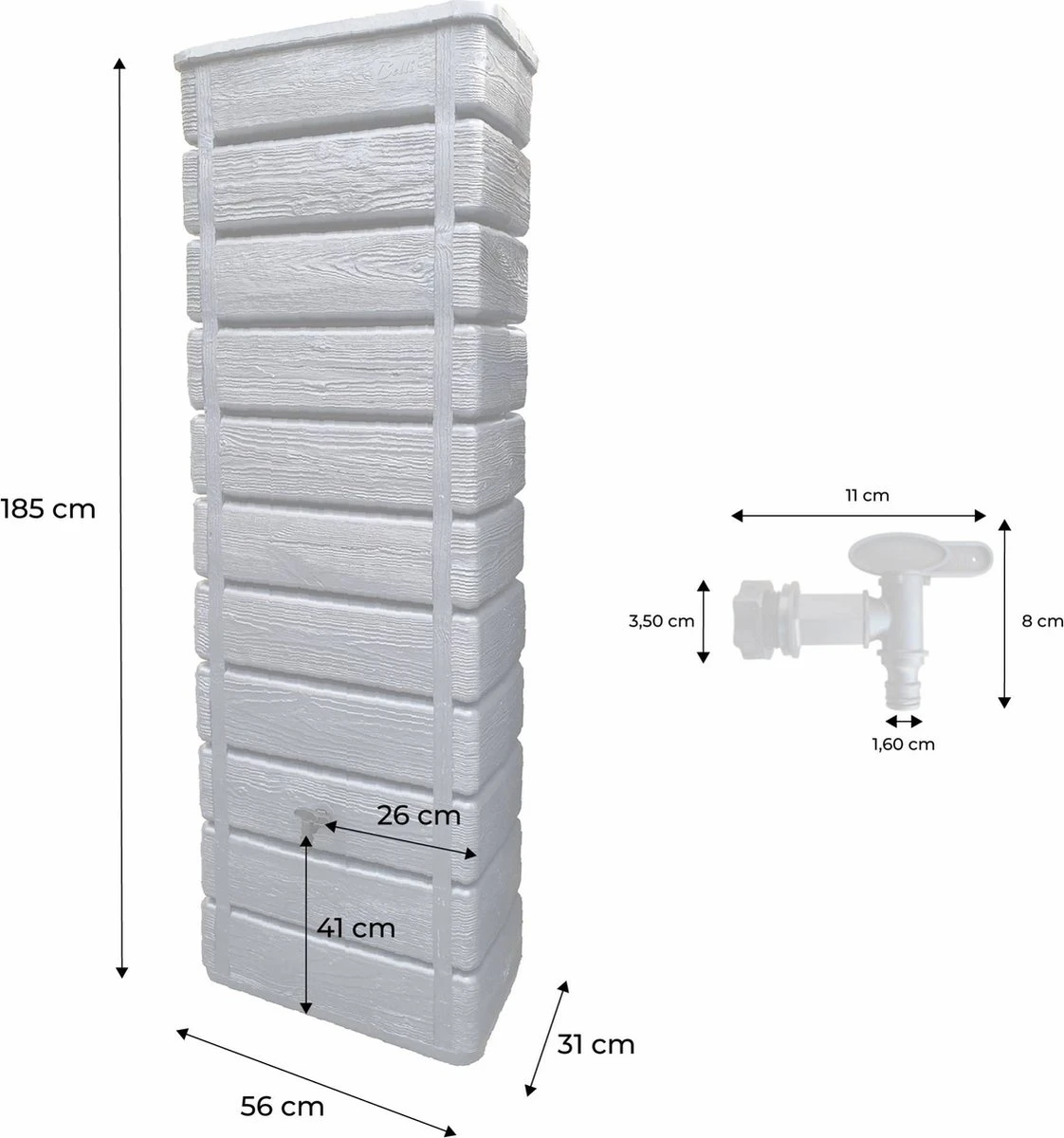 Met deze regenton met een capaciteit van 300L kunt u regenwater opvangen voor het onderhoud van uw tuin. Zodra de muurtank vol is, kunt u deze met het meegeleverde deksel sluiten. Het is mogelijk om de regenton aan te sluiten op de dakgoot met de bijgeleverde aansluiting. De kraan maakt het eenvoudig om het benodigde water te doseren. Zijn blaasgegoten imitatie hout-look geeft een zeer natuurlijke uitstraling aan uw tuin.