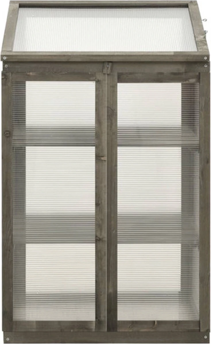 De tuinkas is gemaakt van PC-platen en stevig hout, waardoor hij stabiel en duurzaam is. Er zijn twee schappen die voor voldoende ruimte zorgen voor je planten, bloemen en kruiden. Het is eenvoudig om planten water te geven of uit de kas te halen dankzij het klapdeksel.