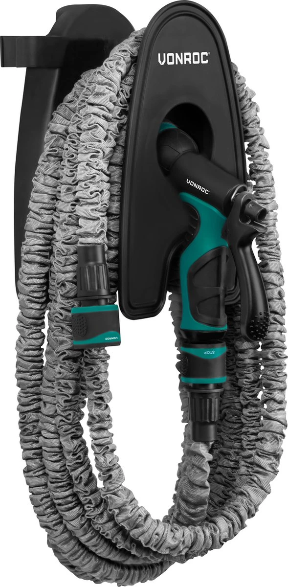 Deze tuinslang van VONROC is een heus wonder! Wanneer je de slang op de kraan aansluit wordt deze drie keer zo lang en bereik je een lengte van wel 10 meter. Wanneer je de kraan uitzet, krimpt de slang automatisch weer in. Zo is de slang gemakkelijk op te tillen én op te bergen op de meegeleverde muursteun. De steun is gemakkelijk aan de muur te bevestigen en de slang kan er zeer eenvoudig omheen worden gewikkeld.